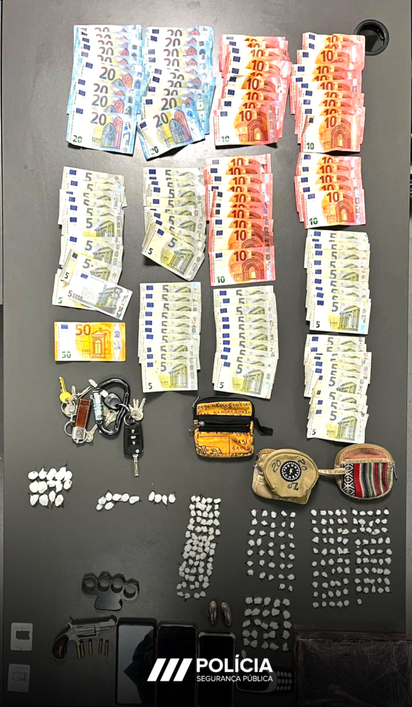 Após ter sido revistado, efetuada busca à viatura, bem como realizada uma outra à sua residência, foram apreendidos cerca de dois quilos de drogas, bem como três balanças de precisão, um revólver, calibre. 22 e uma munição .32 m/m, uma soqueira e 1115 euros em dinheiro.